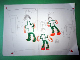 『えがいたものは、サッカーコート、サッカーをやる人、ビブスです。』