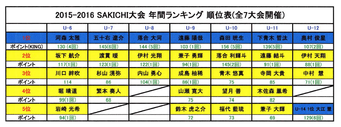 U-12※U−12につきましては、参加人数の関係でベスト5までの発表となります。